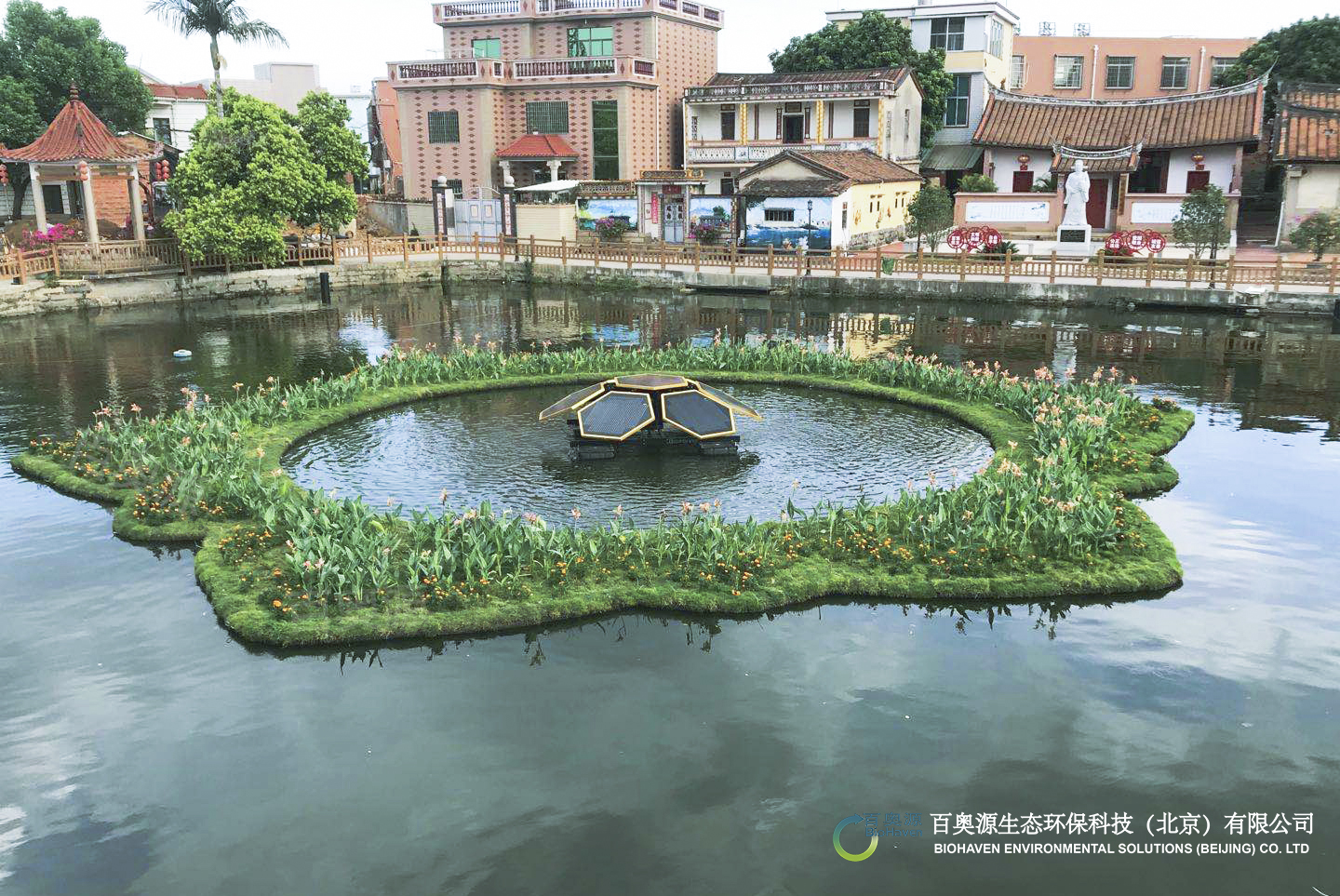 漳州角美鎮(zhèn)埔尾村祠堂大塘為白石林先生祠、進士牌及傳統(tǒng)民居等古建筑環(huán)繞,是埔尾村重要的水景觀節(jié)點,更是漳州臺商投資區(qū)廉政教育基地及埔尾村鄉(xiāng)賢鄉(xiāng)訓館的主要配套景點。埔尾村扎實推進鄉(xiāng)村振興戰(zhàn)略,在實施農(nóng)村污水收集處理工程的基礎上,結合截污納管、補水措施等工程,創(chuàng)新采用的浮動凈水廠技術,以生態(tài)手段同步實現(xiàn)水質(zhì)改善與景觀提升,打造大塘優(yōu)美水環(huán)境的目標,并與埔尾村古建筑景觀互映互襯,彰顯千年古村落的獨有生態(tài)之美。