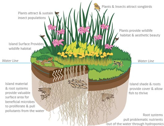 百奧源®浮動濕地載體的孔隙結(jié)構(gòu)保證植物根系的充分伸展并有效透氧,同時載體提供足夠的浮力保證根系不全部浸沒在水中,種植的水陸生植物都能夠適應生長。植物以落子、分根等不同方式在載體密集生長,經(jīng)過幾個生長周期后植株密度高于陸地栽植,植物根系穿過纖維材料空隙,可深入水下1.5米空間,最大化的發(fā)揮植物的吸收作用,也為水生動物提供食物和棲息庇護。